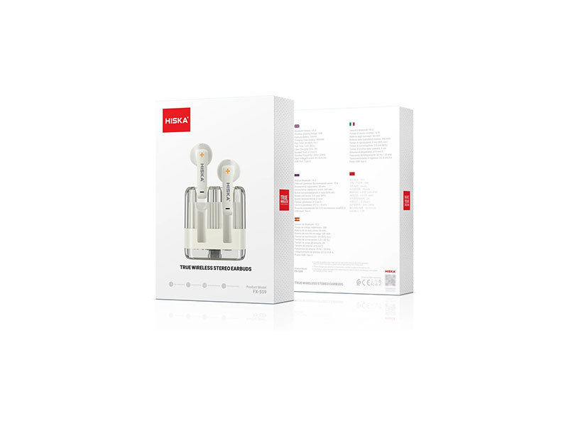 طراحی و تولید هندزفری بلوتوثی به دلیل حذف برخی از محدودیتهای گوشی موبایل مانند امکان مکالمه امن حین رانندگی، گوش دادن به موسیقی در حال ورزش و رفع مشکل پیچ خوردن و پارگی سیم هندزفری ها مورد استقبال بینظیر افراد قرار گرفت. هندزفری بلوتوثی هیسکا مدل FX-559 نمونهای باکیفیت از هدفونهای بلوتوثی است که سبک بوده و استفاده طولانی مدت از آن شما را آزار نمیدهد و میتوانید در هر موقعیتی به راحتی موسیقی مورد علاقه خود را گوش بدهید. بدنه هندزفری بی سیم هیسکا FX-559 از پلی کربنات نسوز و پلاستیک ABS ساخته شده که مقاومتی بسیار بالا را به بدنهی هندزفری داده؛ طراحی شفاف کیس آن، این محصول را از دیگر محصولات از نظر ساختاری متمایز کرده و فوقالعاده جذاب است. ابعادی برابر با 19*42*46 میلیمتر دارد. جمعوجور است و به آسانی درون جیب جا میگیرد. گوشیها از نوع نیمه در گوش هستند؛ در ساختار آنها خبری از کلاهک سیلیکونی نیست اما به خوبی در گوش قرار میگیرند و هنگام استفاده طولانی مدت هم احساس ناراحتی نخواهید کرد. هیسکا برای اتصال به هندزفری وایرلس FX-559، بلوتوث نسخه 5.3 را در نظر گرفته تا تجربه اتصالی سریع را برایتان به ارمغان بیاورد. برد مسافتی آن هم حدود 10 متر بدون مانع است. باتری لیتیوم پلیمری محفظه هدفون هیسکا ظرفیتی برابر با 300 میلیآمپر ساعت دارد و ظرفیت هدفونها هم برابر با 30 میلیآمپر ساعت است که با شارژ کامل میتواند 4 ساعت پخش موسیقی، در حالت مکالمه 3.5 ساعت مورد استفاده قرار گیرد. شارژ محصول توسط درگاه تایپ سی موجود در کیس به مدت حدود 2 ساعت انجام پذیر است. پنلهای لمسی که روی هندزفری وایرلس هیسکا طراحی شده، استفاده آسانتر را برای کاربر به همراه دارد. میتوانید از آن برای کم و زیاد کردن صدا، تغییر آهنگ، قطع یا وصل تماس تلفنی، پلی و پاز کردن موسیقی استفاده نمایید.