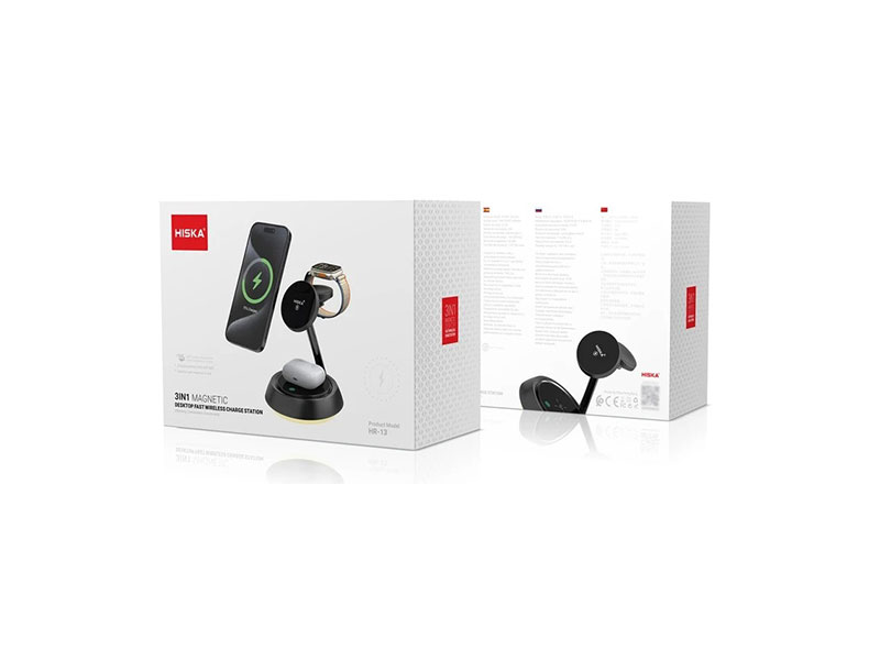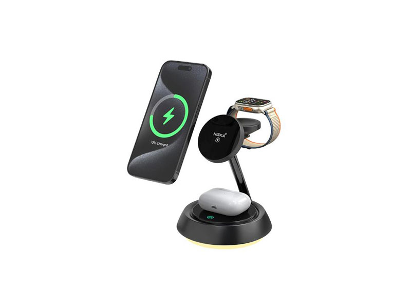 شارژر بیسیم چندکاره هیسکا مدل HR-13، دستگاهی کارآمد و شیک است که امکان شارژ همزمان گوشی، ساعت و هدفون را برای شما فراهم میکند. این شارژر ۳ در ۱ با طراحی زیبا و مینیمال خود، علاوه بر عملکرد بالا، بهراحتی با دکور هر فضایی هماهنگ میشود. هیسکا HR-13 برای کسانی که به دنبال سرعت و کارایی بالا در شارژ دستگاههای خود هستند، انتخابی مناسب است. این شارژر با ورودیهای ۵V/۲A، ۹V/۲A، و ۱۲V/۲A کار میکند و از انواع آداپتورهای استاندارد پشتیبانی میکند. توان خروجی آن برای گوشی (۱۵W، ۱۰W، ۷.۵W، ۵W)، ساعت (۲.۵W) و هدفون (۵W) تنظیم شده است و امکان شارژ سریع و ایمن دستگاههای شما را فراهم میآورد. همچنین، رابط USB-C در این شارژر به انتقال بهتر انرژی کمک میکند. فرکانس شارژ آن ۱۱۰-۲۰۵ کیلوهرتز است و با جذب مغناطیسی قوی، دستگاهها را بهصورت ایمن روی پایه نگه میدارد تا از افتادن ناگهانی جلوگیری شود. شارژر هیسکا HR-13 با ارائه شارژ سریع تا ۱۵ وات، دستگاهها را در زمان کمتری آماده استفاده میکند. این شارژر ایمنی بالایی دارد و با داشتن محافظهای گرمایی و ضد اضافه بار، از دستگاههای شما محافظت میکند. نور ملایم داخلی آن در هنگام شارژ، فضایی آرامشبخش ایجاد میکند و استفاده از آن در شب نیز مناسب است. استفاده از این دستگاه بسیار راحت است؛ کافیست گوشی، ساعت یا هدفون خود را روی پایه قرار دهید تا بهصورت خودکار شارژ شوند، بدون نیاز به اتصال دستی یا سیمهای اضافی. این محصول طراحی مشکی براق و جمعوجوری دارد که بهخوبی در هر فضایی جا میگیرد و جلوهای زیبا به محیط شما میبخشد. شارژر بیسیم چندکاره هیسکا مدل HR-13، گزینهای ایدهآل برای کسانی است که میخواهند بهسادگی و با یک دستگاه، چندین دستگاه را بهصورت ایمن و سریع شارژ کنند.