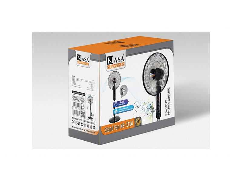 پنکه ناسا الکتریک NS-1114 یکی از انواع پنکههای ایستاده است، که دارای یک پایه تلسکوپی و پرهها و شبکه محافظ میباشد. از همان ابتدا باید بگویم که با یک محصول خوش تراش روبرو هستید و قرار است مشخصات ظاهری پنکهای را مشاهده نمایید، که جلوهی خاصی به دکوراسیون منزل خواهد داد. بدنه مشکی رنگی که برای این پنکه در نظر گرفته شده به لوکس بودن آن کمک کرده و پنکه را از حالت ساده و مینیمالیستی درآورده است. یک پایه دایرهای شکل پلاستیکی، پایه تلسکوپی و کل مجموعه را نگهداری خواهد کرد. این پنکه 16 اینچی بوده و پایه تلسکوپی آن قابلیت تنظیم ارتفاع را دارد. میتوان متناسب با نیاز خود ارتفاع پنکه را تنظیم نمایید و آن را در کوتاهتر و یا بلندتر از حالت نرمال قرار داد.
